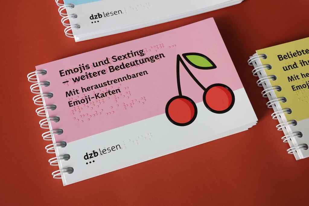 In unseren Emoji-Heften werden häufig verwendete Emojis beschrieben und taktil erfahrbar. Die Motivseiten sind perforiert und leicht heraustrennbar. Sie können auf der Rückseite beschrieben und zum Beispiel als Grußkarte verwendet werden. Auf den Motivseiten sind Emojis in Kombination mit einem Spruch oder Begriff abgebildet. Motiv und Text werden durch Lack fühlbar.