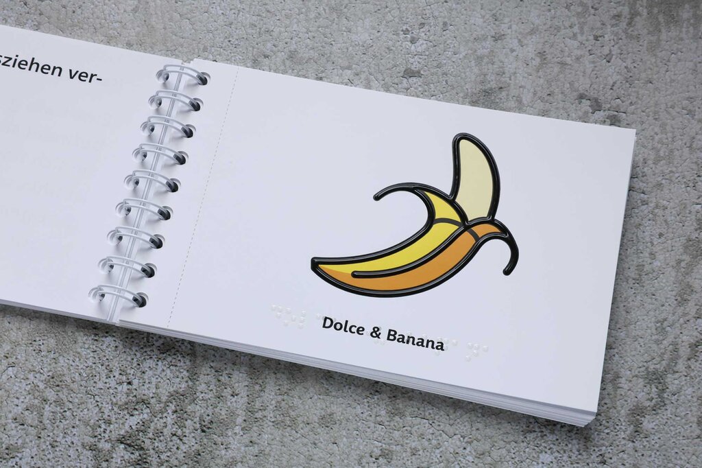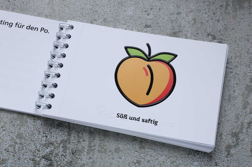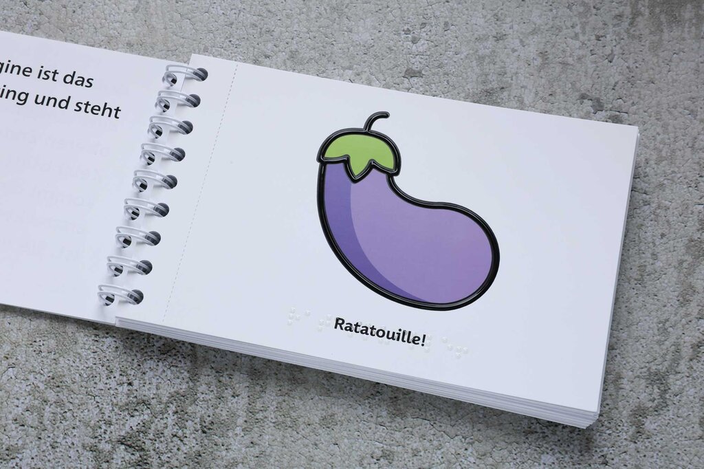 Ringbuch mit 10 Motiven, Großdruck, Lack-Brailleschrift und geprägter Brailleschrift in Vollschrift, Format 190 × 120mm, Format heraustrennbare Karte 170 × 120mm, Drahtkammbindung