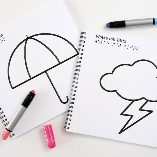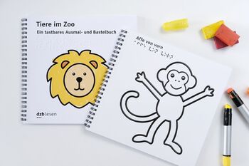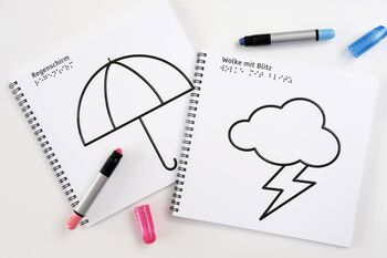 Die tastbaren Ausmalbücher mit verschiedenen Motiven laden euch zum Ertasten, Ausmalen, Bekleben und Ausschneiden ein. Ganz nach euren Vorstellungen und eurer Fantasie könnt ihr eigene Bilder gestalten. Wer möchte kann die Bilder ganz einfach heraustrennen und an die Wand hängen oder verschenken. Jedes Motiv hat eine Bildüberschrift in Groß- und Brailleschrift.