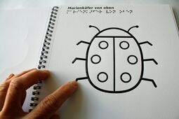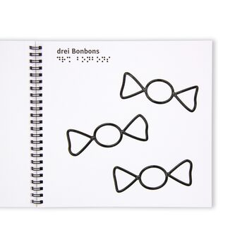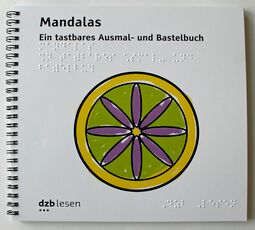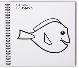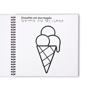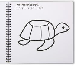 Je eine Broschur mit Spiralbindung und 8 Motiven aus Relieflack, perforierte Seiten, Braille-Vollschrift und Großdruck, Format 22 x 21 cm