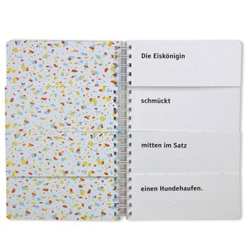 Wer baut den lustigsten Quatsch-Satz? Durch willkürliches Umklappen der vier Teile jeder Seite entstehen immer wieder neue Sätze zum Lachen. Einfache Satzbausteine können zu ganz neuen Quatschsätzen kombiniert werden. Wie wär’s mit: Die Zahnfee verschlingt am Frühstückstisch einen Elefanten? Oder: Mein Hund entführt vor dem Zähneputzen ein Krümelmonster?