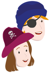 Zwei Piratenkinder (Junge mit Augenbinde, Mädchen mit Piratenhut)